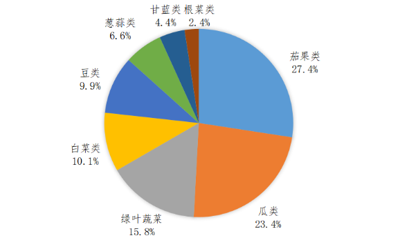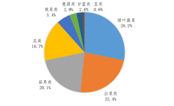 蔬菜在田面积稳中有减。5月我省雷雨频繁,强降雨对蔬菜播种、移栽、采收等工作有所影响,预计5月我省蔬菜在田面积354.3万亩,环比下降0.6%,其中白菜类和绿叶蔬菜类在田面积明显减少。据省农业信息监测体系数据,我省规模基地在田蔬菜以茄果类、瓜类和绿叶蔬菜为主,在田面积占比分别为27.4%、23.4%和15.8%。其中菜心、苦瓜和辣椒在田面积较多。