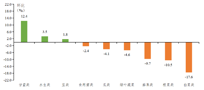 与上月相比,大部分蔬菜交易量减少,其中白菜类、根菜类和茄果类明显减少,环比分别下降17.6%、10.5%和9.7%;绿叶蔬菜、瓜类和食用菌类蔬菜交易量小幅减少。交易量明显增加的是甘蓝类蔬菜,环比增长12.4%;水生类和豆类蔬菜稳中略增。