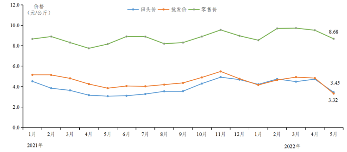 据省农业信息监测体系数据,35种大宗蔬菜田头均价为3.45元/公斤,较上年同期上涨0.38元/公斤,同比上涨12.4%,其中白萝卜、胡萝卜和苦瓜上涨明显。批发均价3.32元/公斤,较上年同期跌0.53元/公斤,同比下跌13.7%,其中下跌明显的是绿叶蔬菜,如油麦菜和生菜。零售均价为8.68元/公斤,较上年同期涨0.51元/公斤,同比上涨6.3%,其中上涨明显的是大番茄、苦瓜和冬瓜。