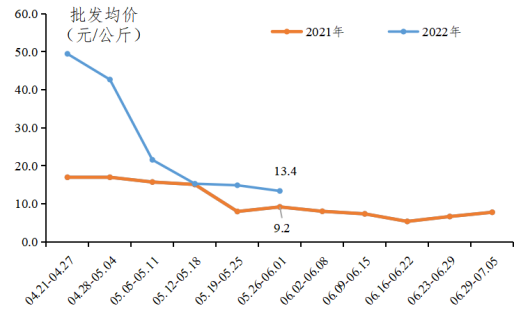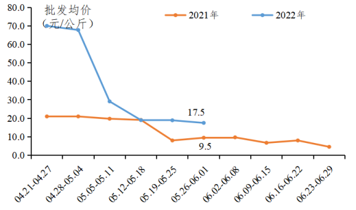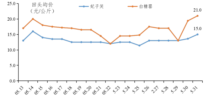 荔枝批发价格远好于去年同期。5月荔枝市场销售顺畅,市场行情表现较好,白糖罂荔枝和妃子笑荔枝批发均价分别为31.6元/公斤和 19.7元/公斤,同比上涨223.4%和110.7%。随着荔枝进场交易量增加,本月价格理性回落,市场行情走势较稳定。省外荔枝行情保持较高水平,白糖罂荔枝批发价17.5元/公斤,妃子笑荔枝批发价13.8元/公斤,同比上涨2.8%。
