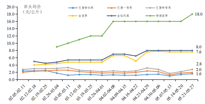 零售行情上涨。受市场供货减少,零售市场整体走高,据省农业信息监测体系数据,主要零售平台金钻凤梨零售均价23.4元/公斤,环比上涨14.8%,金菠萝零售均价分别为18.2元/公斤,环比下降7.3%。