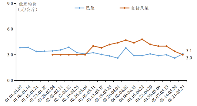5月全省菠萝总量供应减少,但上市产区增加,湛江产区巴厘菠萝、金钻凤梨等上市进度达95%,中山产区神湾菠萝进入上市高峰期,上市进度达65%,但总量占比较小,陆丰、惠来产区无刺卡因菠萝尚处于零星上市,待7、8月迎来上市高峰季节。