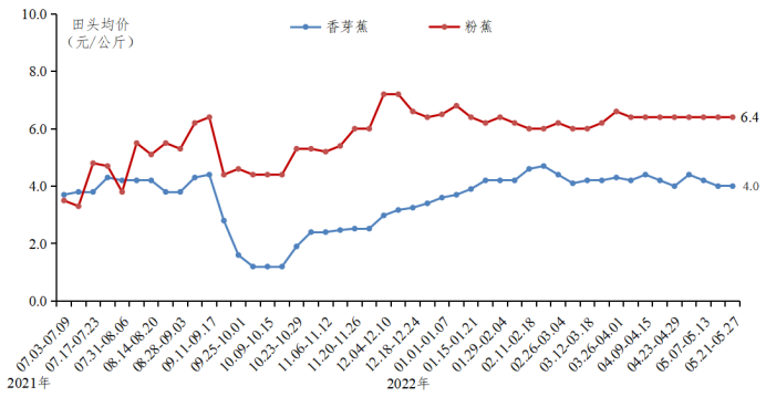 香蕉田头均价整体回落。据省农业信息监测体系数据,粉蕉田头均价为6.4元/公斤,环比持平,香芽蕉田头均价为4.1元/公斤,环比下降2.4%。
