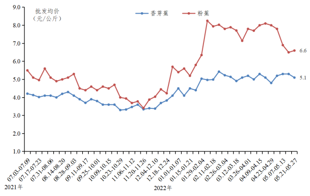 香蕉批发价格总体下降,省外行情保持上涨。香芽蕉批发均价为5.2元/公斤,环比上涨2.0%,粉蕉批发均价6.8元/公斤,环比下降12.3%。省外主要批发市场香蕉均价为6.5元/公斤,环比上涨2.6%。