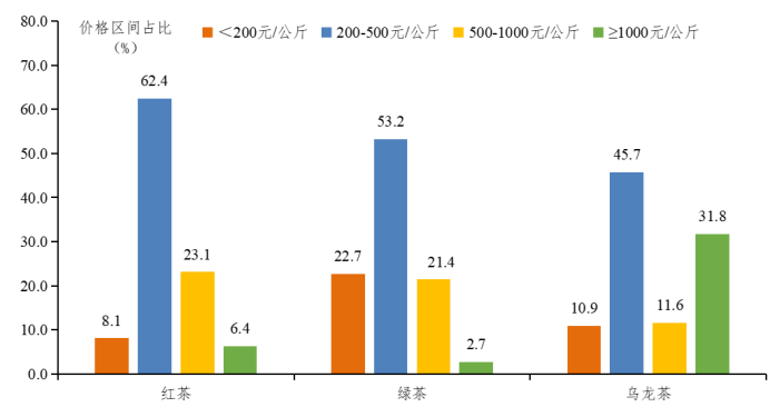 据省农业信息监测体系数据,红茶均价小幅上涨,绿茶和乌龙茶均价小幅回落,红茶、绿茶和乌龙茶销售均价分别为409.4元/公斤、334.3元/公斤和797.1元/公斤;利润率分别为51.1%、42.8%和43.9%。干茶售价以200-500元/公斤居多,三类茶销售价格在该区间占比均超过45%,红茶、绿茶和乌龙茶分别为62.4%、53.2%和45.7%;乌龙茶在1000元以上/公斤区间售价占比为31.8%。