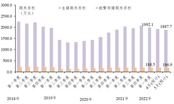 生猪存栏环比下降。据省农业信息监测体系数据,规模基地生猪存栏环比下降1.6%,同比下降0.3%;规模基地能繁母猪补栏率为81.6%,致能繁母猪存栏环比下降0.4%,同比下降1.9%。预估5月末我省生猪存栏降至1887.7万头,其中能繁母猪存栏为186.9万头,达到农业农村部划定的正常保有量的98.4%,为正常波动区间。