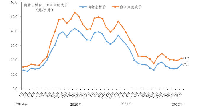 肉猪出栏月均价上涨。5月1日起省外生猪调运将进一步收紧,养殖户普遍看涨,猪价持续上涨,月末猪价高位涨至18.6元/公斤。