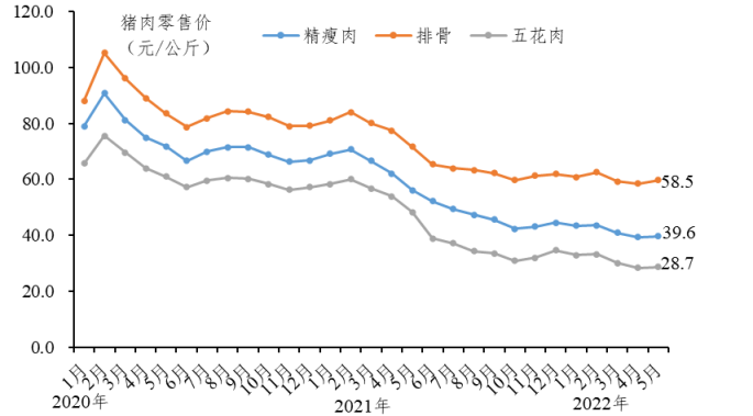 猪肉零售价上涨,据地市“菜篮子”数据,排骨均价、精瘦肉均价和五花肉均价环比分别增长2.2%、0.5%和1.4%,同比均下降10%以上。