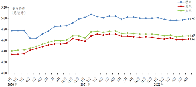 批发市场大米价格环比上涨。据省农业信息监测体系数据,大米批发均价为4.68元/公斤,环比微涨0.21%,同比下降1.89%;其中籼米批发价格为4.62元/公斤,环比微涨0.22%,同比下降1.91%;粳米批发价格为4.99元/公斤,环比微涨0.4%,同比下降0.99%。