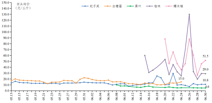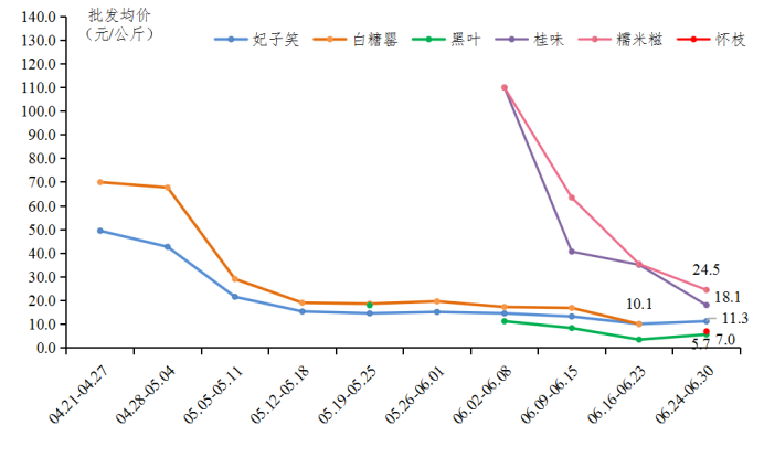 荔枝上市品种增加。5月中旬以来,因持续降雨、光照不足、气温较低导致各主产区荔枝产量进一步受影响,6月荔枝上市量同比下降。其中上旬上市品种为白糖罂和妃子笑,端午节迎来上市小高峰,中旬进入收尾阶段,中下旬主要上市品种为桂味、糯米糍和黑叶。