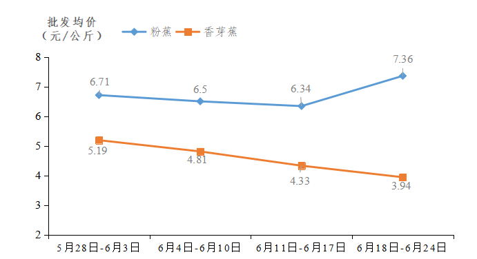 市场行情好于去年同期。省内主要批发市场香蕉批发均价为5.24元/公斤,环比下降9.3%,同比上升18.6%。其中香芽蕉市场行情持续4周下跌,批发均价为4.56元/公斤,环比下降12.6%,同比上升7.0%;粉蕉市场行情止跌回升,批发均价为6.65元/公斤,环比下降3.3%,同比上升37.7%。
