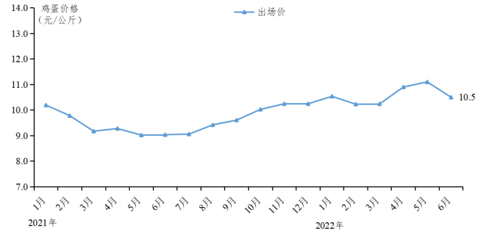 肉鸡价格上涨。6月在供应下降周期及猪价上涨带来的替代性消费增加影响下,肉鸡价格上涨。据省农业信息监测体系数据,规模化基地肉鸡出栏价为18.7元/公斤,环比上涨5.1%,批发价为20.6元/公斤,环比上涨7.9%。据地市“菜篮子”数据,白条鸡零售价为38.1元/公斤,环比微降0.5%。