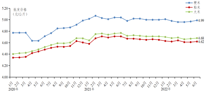 大米批发价小幅下行。据省农业信息监测体系数据,主要批发市场大米主要来源省外,上半年主要批发市场大米均价4.68元/公斤,同比下降1.06%。其中籼米批发均价4.62元/公斤,同比下降1.07%;粳米批发均价4.99元/公斤,同比下降0.99%。