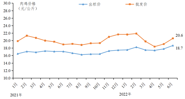 肉鸡价格探底回升。上半年肉鸡出栏价格在4月探底后持续回升,出栏均价为17.9元/公斤,同比上涨5.2%。批发均价为20.2元/公斤,同比上涨0.7%。