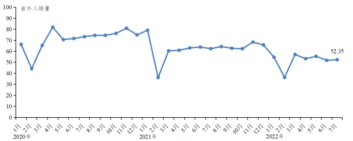 7月各地新稻上市拉动市场行情上涨,部分经销商提前备货,大米流通量出现回暖反弹并恢复至正常水平。据省农业信息监测体系数据,本月大米省外入场量环比指数为52.35,环比上涨1.02%,同比下降16.98%;大米总成交量环比指数为51.99,环比上涨0.48%,同比下降16.55%。