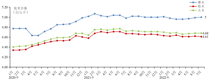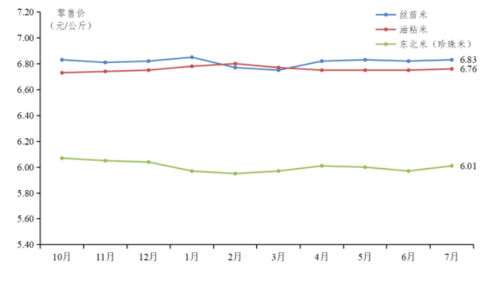 大米零售价格平稳运行。7月大米消费端供求平衡,零售价整体保持与6月持平,其中细分品类价格稳中有涨。据地级市“米袋子”数据,农贸市场大米6.43元/公斤、粳米6.06元/公斤、籼米6.48元/公斤,环比均微涨0.2%。具体品种来看,丝苗米价格6.83元/公斤,油粘米价格6.76元/公斤,环比均微涨0.2%;东北米(珍珠米)价格6.01元/公斤,环比微涨0.67%。