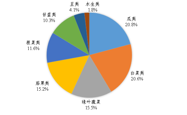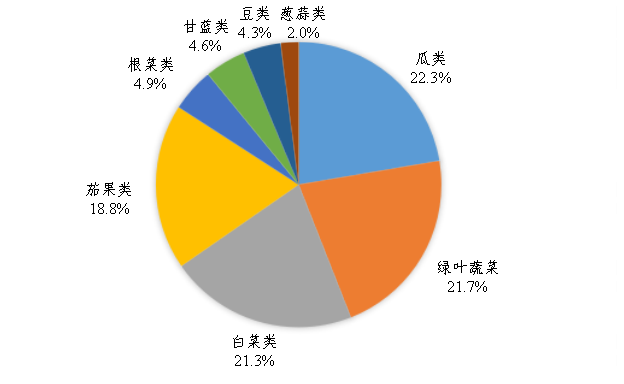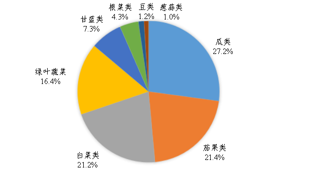 蔬菜产量减少。受前段时期强降雨及水灾影响,蔬菜基地虽积极开展播种生产,但本月迎来高温天气不利于蔬菜生产劳作,可上市供应蔬菜有所减少。预计7月我省蔬菜总产量约306万吨,环比下降3.1%。与上月相比,绿叶蔬菜和瓜类蔬菜产量明显减少。规模基地瓜类、茄果类、白菜类蔬菜产量占比均超20%。产量排名前三品种是菜心、茄子和苦瓜,占比分别是10.7%、9.3%和8.8%。
