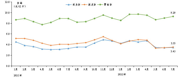 本月大宗蔬菜田头交易总体价格较平稳,据省农业信息监测体系数据,大宗蔬菜田头均价为3.45元/公斤,环比上涨1.4%,其中上涨幅度较大品种是南瓜、辣椒和冬瓜。批发均价3.53元/公斤,环比上涨3.1%,上涨明显品种是黄瓜、花椰菜和油麦菜。主要消费渠道零售均价9.29元/公斤,环比上涨3.5%,蒜、丝瓜和黄瓜价格上涨明显。