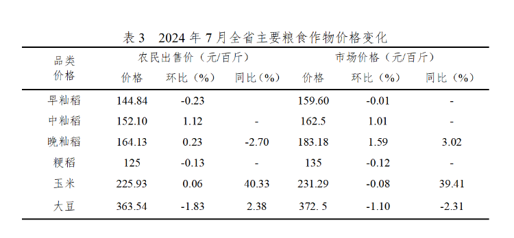 本月我省总体气温偏高、日照正常、降水偏少,以晴热天气为主。天气条件总体有利于早稻灌浆乳熟和成熟收获。全省各粮食基点县市场价格的变化相对平稳,未见明显波动。早籼稻的农民出售均价和市场价格分别为144.84元/百斤和159.6元/百斤,环比价格持平。其他主要粮食作物中籼稻、晚籼稻、粳稻、玉米和大豆的同比和环比价格保持稳定。受市场供需变化影响,玉米的价格相对去年同期出现上涨,农民出售价和市场价格分别为224.53元/百斤和230.03元/百斤,涨幅分别为40.33%和39.41%。
