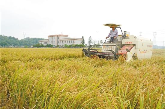 恩平市君堂镇水稻专业收割户冯锡新驾驶收割机穿梭于田间收割水稻。