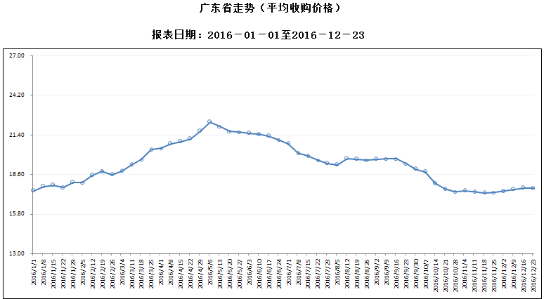 据对全省53家规模以上生猪定点屠宰样本企业监测统计,2016年12月19-25日,生猪平均收购价格为17.60元/公斤,较前一周下降0.11%,较去年同期上涨0.57%。本周较上周环比降幅较大的地区有江门市3.35%,东莞市3.33%,梅州市2.17%。
