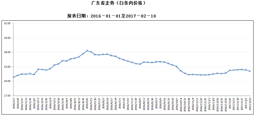 据对全省53家规模以上生猪定点屠宰样本企业监测统计,2017年2月6-12日,生猪平均收购价格为18.04元/公斤,较前一周下降1.20%,较去年同期下降2.64%。本周较上周环比降幅较大的地区有韶关市3.72%,潮州市3.08%,清远市2.77%。