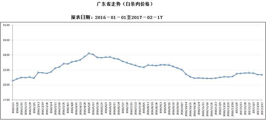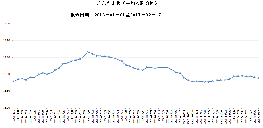 据对全省53家规模以上生猪定点屠宰样本企业监测统计,2017年2月13-19日,生猪平均收购价格为17.88元/公斤,较前一周下降0.89%,较去年同期下降4.84%。本周较上周环比降幅较大的地区有揭阳市3.28%,潮州市2.90%,茂名市2.47%,但仍有6个市呈上涨态势,其中东莞、深圳涨幅超过1%。