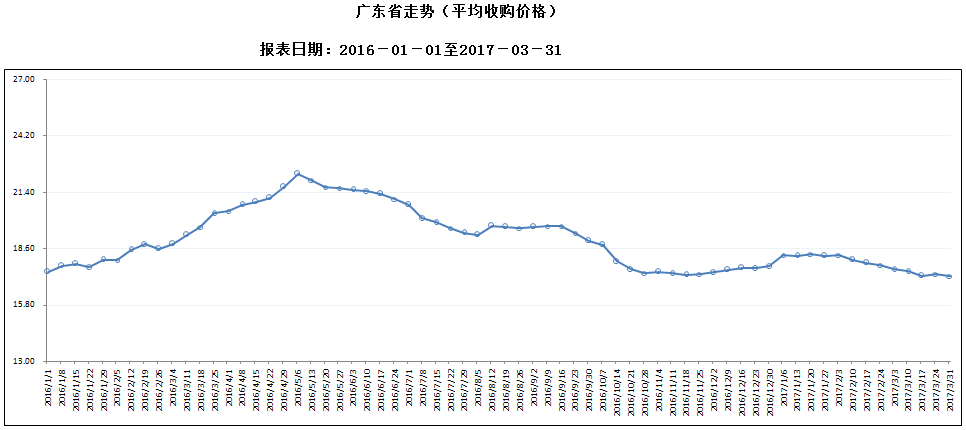 据对全省53家规模以上生猪定点屠宰样本企业监测统计,2017年3月27日-4月2日,生猪平均收购价格为17.22元/公斤,较前一周下降0.58%,较去年同期下降15.79%。本周较上周环比降幅较大的地区有韶关市6.52%,东莞市2.25%,茂名市1.46%,但仍有10个市呈上涨态势。