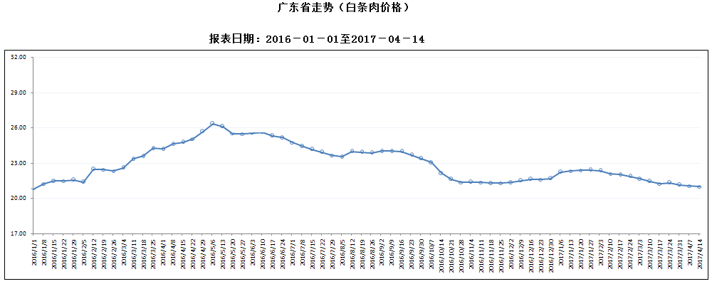 据对全省53家规模以上生猪定点屠宰样本企业监测统计,2017年4月8-14日,生猪平均收购价格为17.07元/公斤,较前一周下降0.52%,较去年同期下降18.33%。本周较上周环比降幅较大的地区有中山市3.24%,湛江市1.70%,茂名市1.64%,但仍有5个市呈上涨态势,其中珠海和梅州涨幅均超过1%。