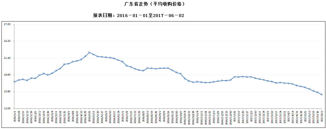 据对全省53家规模以上生猪定点屠宰样本企业监测统计,2017年5月27-6月2日,生猪平均收购价格为15.31元/公斤,较前一周下降2.23%,较去年同期下降28.26%。本周较上周环比降幅较大的地区有梅州市5.80%,韶关市4.72%,珠海市4.11%。