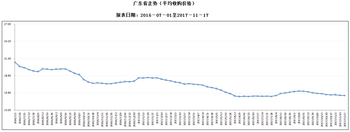 据对全省53家规模以上生猪定点屠宰样本企业监测统计,2017年11月11-17日,生猪平均收购价格为15.37元/公斤,较前一周下降0.13%,较去年同期下降11.10%。本周较上周环比降幅较大的地区有中山市3.62%,阳江市1.40%,云浮市0.67%,但仍有7个市呈上涨态势,其中珠海涨幅超过4%。