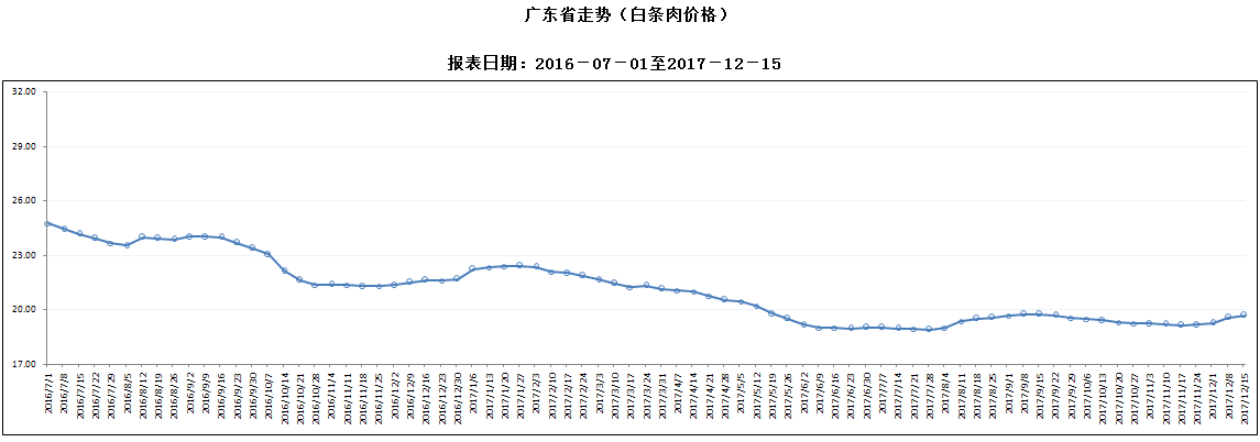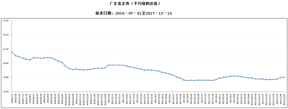 据对全省53家规模以上生猪定点屠宰样本企业监测统计,2017年12月9-15日,生猪平均收购价格为15.87元/公斤,较前一周上涨0.63%,较去年同期下降9.93%。本周较上周环比涨幅较大的地区有珠海市2.60%,汕头市2.31%,云浮市2.03%,但仍有4个市呈下降态势。