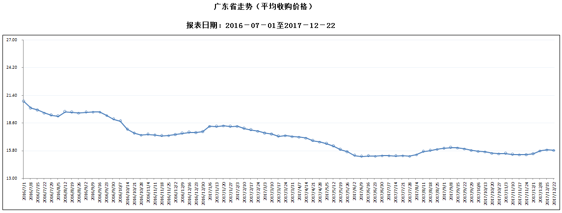据对全省53家规模以上生猪定点屠宰样本企业监测统计,2017年12月16-22日,生猪平均收购价格为15.82元/公斤,较前一周下降0.32%,较去年同期下降10.11%。本周较上周环比降幅较大的地区有珠海市1.90%,湛江市1.79%,肇庆市1.61%,但仍有6个市呈上涨态势,其中江门涨幅超过3%。