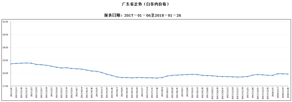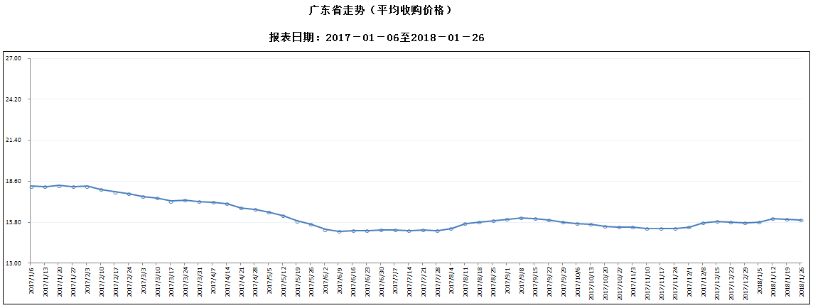据对全省53家规模以上生猪定点屠宰样本企业监测统计,2018年1月20-26日,生猪平均收购价格为15.97元/公斤,较前一周下降0.25%,较去年同期下降12.40%。本周较上周环比降幅较大的地区有江门市3.53%,湛江市1.37%,阳江市1.36%,但仍有7个市呈上涨态势,其中深圳和汕头涨幅分别超过2%和3%。