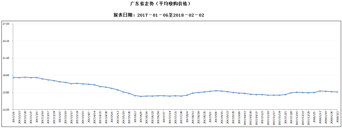 据对全省53家规模以上生猪定点屠宰样本企业监测统计,2018年1月27-2月2日,生猪平均收购价格为15.90元/公斤,较前一周下降0.44%,较去年同期下降12.92%。本周较上周环比降幅较大的地区有汕头市2.12%,湛江市2.09%,广州市1.54%,但仍有4个市呈上涨态势,其中梅州涨幅超过3%。