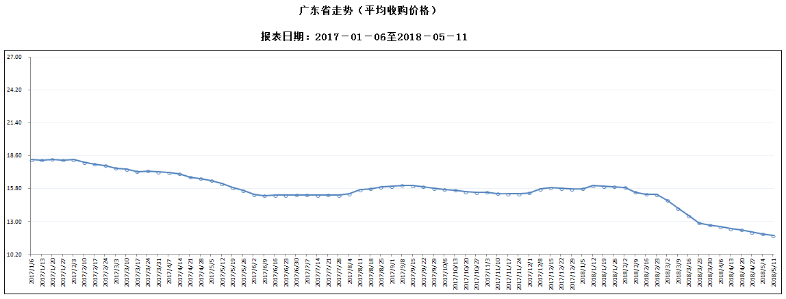 据对全省53家规模以上生猪定点屠宰样本企业监测统计,2018年5月5-11日,生猪平均收购价格为11.80元/公斤,较前一周下降1.26%,较去年同期下降27.34%。本周较上周环比降幅较大的地区有广州市4.26%,汕头市4.22%,清远市3.76%,但仍有4个市呈上涨态势。