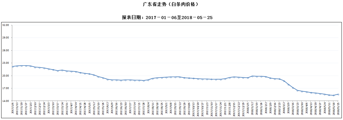 广东省屠宰生猪及肉品价格周报(2018年第21周)生猪及猪肉价格环比上涨、同比下降
