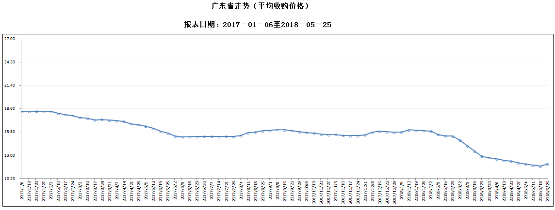 据对全省53家规模以上生猪定点屠宰样本企业监测统计,2018年5月19-25日,生猪平均收购价格为11.95元/公斤,较前一周上涨2.22%,较去年同期下降23.69%。本周较上周环比涨幅较大的地区有珠海市9.01%,深圳市6.64%,佛山市5.00%,但仍有3个市呈下降态势,其中惠州和汕头降幅均超过2%。