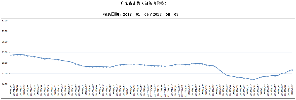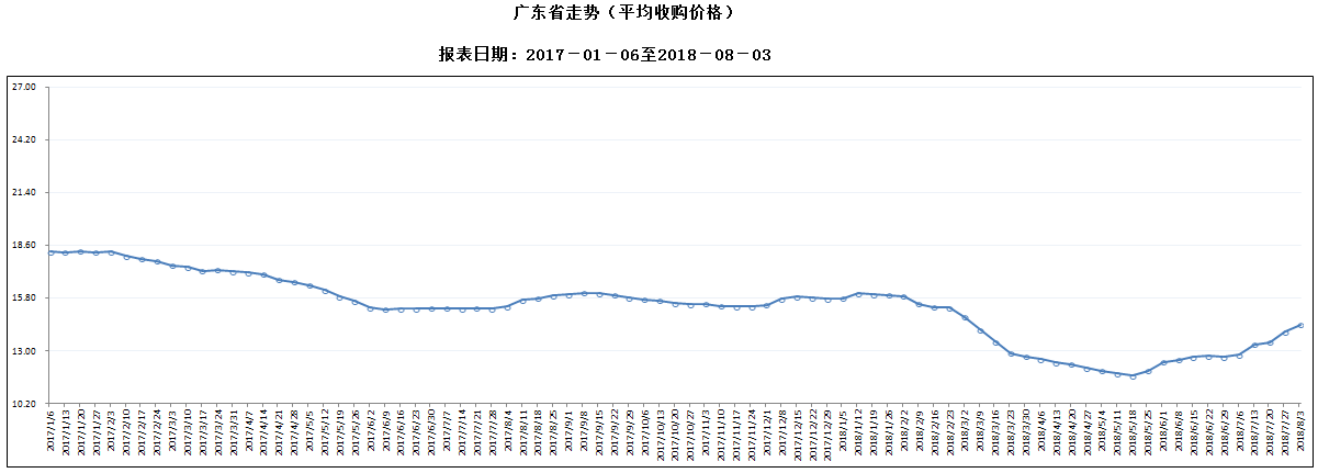 据对全省53家规模以上生猪定点屠宰样本企业监测统计,2018年7月28-8月3日,生猪平均收购价格为14.41元/公斤,较前一周上涨2.86%,较去年同期下降6.25%。本周较上周环比涨幅较大的地区有肇庆市6.80%,湛江市6.75%,清远市6.25%。但东莞仍呈下降态势,且降幅超过1%。