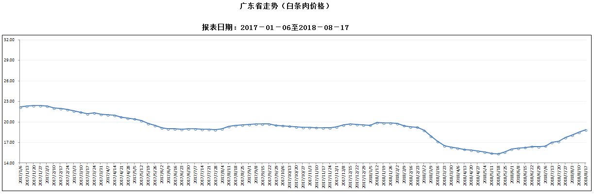 广东省屠宰生猪及肉品价格周报(2018年第33周)生猪及猪肉价格环比上涨、同比下降
