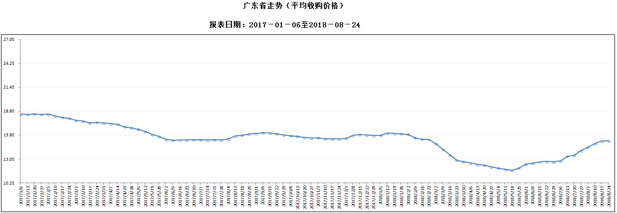 据对全省53家规模以上生猪定点屠宰样本企业监测统计,2018年8月18-24日,生猪平均收购价格为15.12元/公斤,较前一周下降0.07%,较去年同期下降5.08%。本周较上周环比降幅较大的地区有深圳市2.58%,珠海市2.50%,广州市2.11%,但有7个市呈上涨态势,其中揭阳涨幅超过2%。