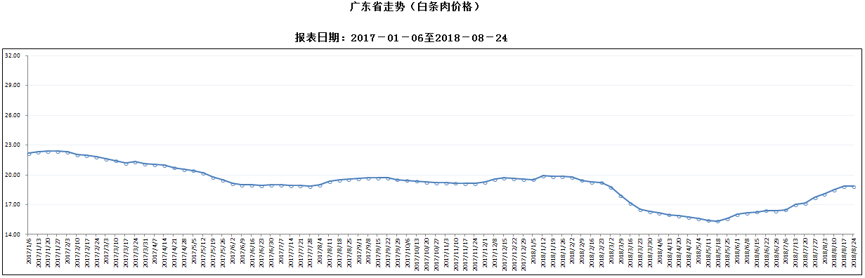 广东省屠宰生猪及肉品价格周报(2018年第34周)生猪平均收购价环比、同比均下降 白条肉出厂价环比持平、同比下降