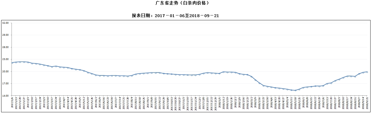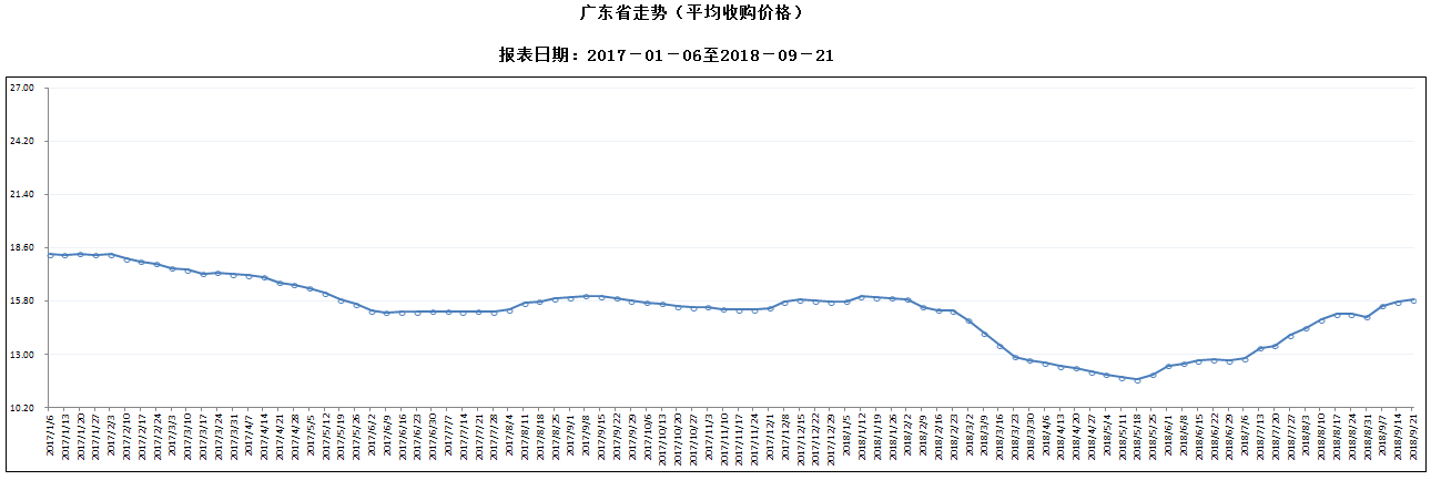 据对全省53家规模以上生猪定点屠宰样本企业监测统计,2018年9月15-21日,生猪平均收购价格为15.89元/公斤,较前一周上涨0.76%,较去年同期下降0.50%。本周较上周环比涨幅较大的地区有东莞市6.12%,汕尾市5.33%,揭阳市2.63%,但有4个市呈下降态势,其中惠州降幅超过4%。