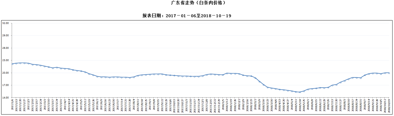 据对全省53家规模以上生猪定点屠宰样本企业监测统计,2018年10月13-19日,生猪平均收购价格为15.96元/公斤,较前一周上涨0.57%,较去年同期上涨2.84%。本周较上周环比涨幅较大的地区有深圳市5.14%,广州市2.22%,肇庆市1.44%,但有4个市呈下降态势,其中江门降幅超过1%。