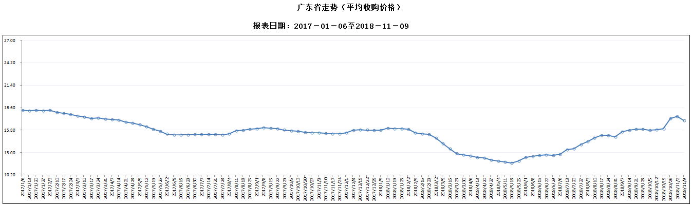 据对全省53家规模以上生猪定点屠宰样本企业监测统计,2018年11月3-9日,生猪平均收购价格为16.99元/公斤,较前一周下降3.14%,较去年同期上涨10.40%。本周较上周环比降幅较大的地区有珠海市6.14%,云浮市5.90%,深圳市5.54%。