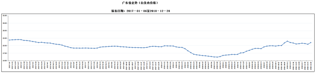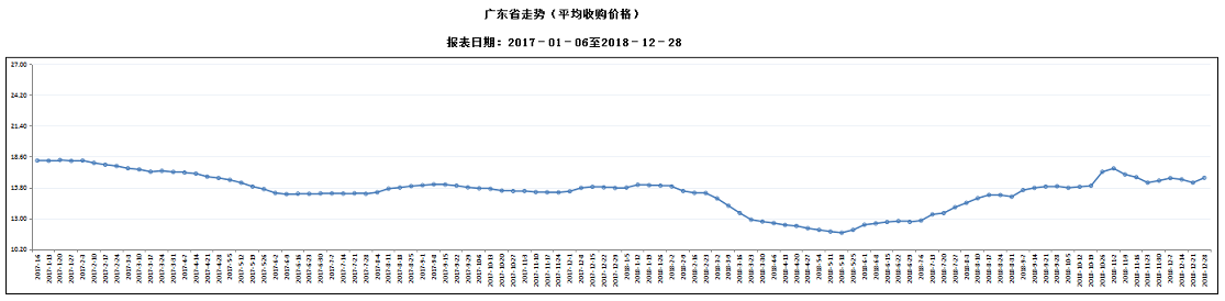 据对全省53家规模以上生猪定点屠宰样本企业监测统计,2018年12月22-28日,生猪平均收购价格为16.69元/公斤,较前一周上涨2.71%,较去年同期上涨5.90%。本周较上周环比涨幅较大的地区有惠州市17.19%,广州市16.93%,中山市12.49%,但有13个市呈下降态势,其中韶关降幅超过7%,湛江降幅超过8%。