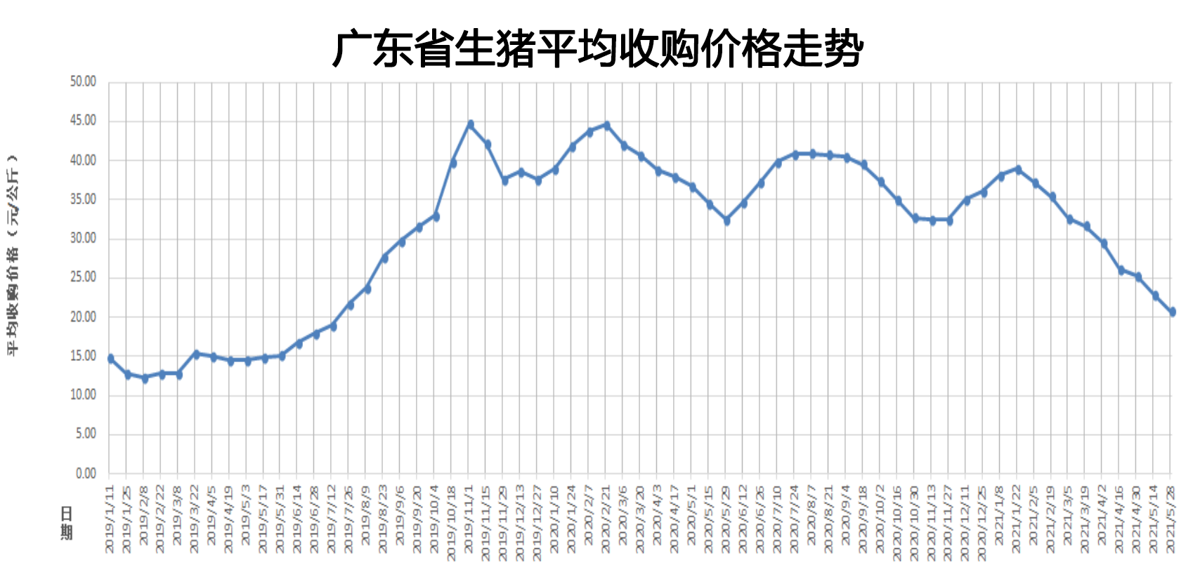 据对全省20个地市199家生猪定点屠宰企业监测统计,2021年5月15-28日,生猪平均收购价格为20.76元/公斤,环比下降9.50%,同比下降36.18%。环比降幅较大的地区有清远市15.32%,汕头市12.01%,湛江市10.60%。