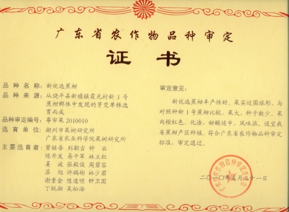 近三年应用面积和产量表现 果实比新1号蕉柑大、高产稳产,综合性状优良,近三年在潮汕地区推广约3000亩,果实价格较好。种植后第二年开始结果,5年生树平均亩产3900公斤。