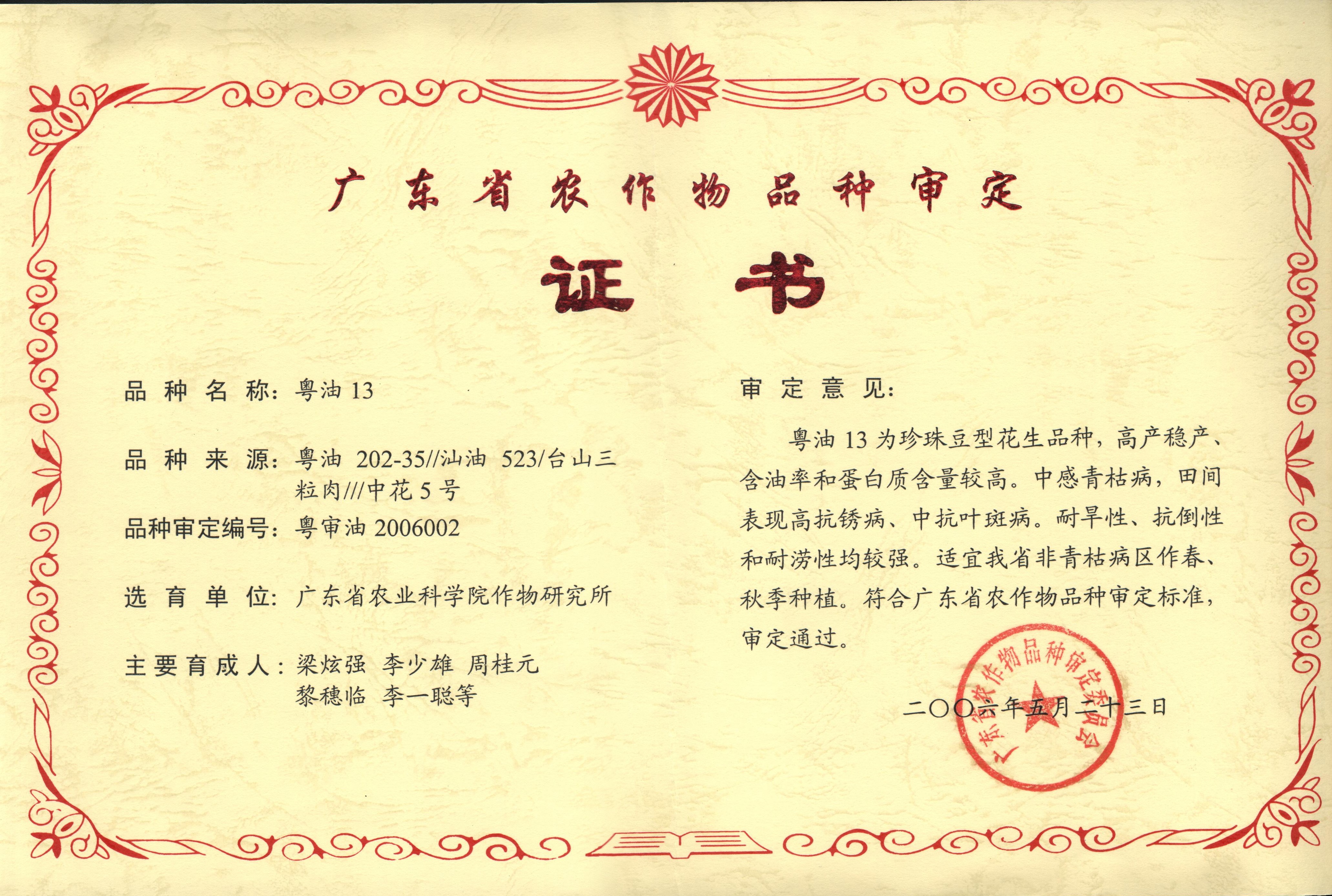 特征特性 “粤油13”属高产品种,一般亩产250-300公斤。该品种是直立珍珠豆型,连续开花,疏枝。该品种株高中等、生势强,株型紧凑,主茎高48.1厘米,分枝长51.7厘米,总分枝数6.9条,有效分枝5.1条,主茎叶数14.8片,收获时主茎青叶数6.7片,叶片大小中等,叶色深绿,抗倒性、耐旱性、耐涝性均较强。高抗叶斑病和锈病,叶斑病2.9级,锈病2.7级。单株果数16.7个,饱果率80.24%,双仁果率74.77%,荚果大,百果重193.2克,公斤果数622个,出仁率66.3%。含油率53.19%。全生育期128天。