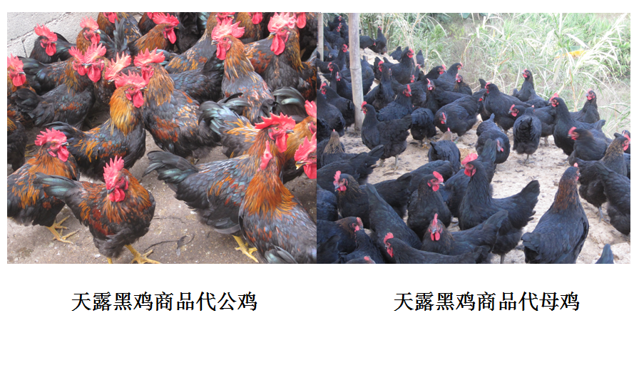 特征特性 该配套系父母代种鸡生产性能优秀,28周龄达产蛋高峰,高峰产蛋率83%以上,66周龄入舍母鸡只产蛋量170-178个,全期种蛋合格率92.8-95.7%,全期种蛋受精率93.5-94.9%,全期受精蛋孵化率90.5-92.1%,至66周龄入舍母鸡只产合格种苗134-147只。商品代肉鸡在保持原有地方品种肉质风味特性的同时,外观和生产性能也得到了较显著的改善。公鸡84日龄前后上市,冠大鲜红,羽毛紧凑,颈羽金黄,性羽、鞍羽红黄,其它部位羽毛黑色,体重1550-1650g,胸肉饱满,胸肌率16.2-17.2%,腿肌发达,腿肌率27.8-28.7%,饲料转化比2.90-2.95:1,成活率96%以上。母鸡105日龄上市,体型团圆,胸腿肌较发达,胸肌率16.2%-17.1%,腿肌率26.6%-27.7%,毛色纯黑色,体重1450-1550g,饲料转化率3.4-3.5:1,成活率96%以上。